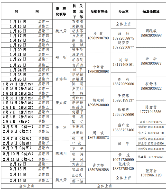 2019年寒假学院值班安排表