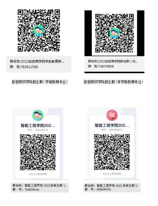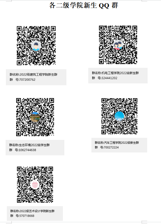 5.为与学校建立直接联系,便于事务通知和咨询,请新同学按照专业归属加入二级学院新生QQ群。(进群二维码和群号附后)