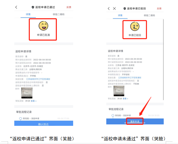 1.出示“今日校园”APP“返校申请已通过”的界面,“返校申请被驳回”的同学不允许进校。